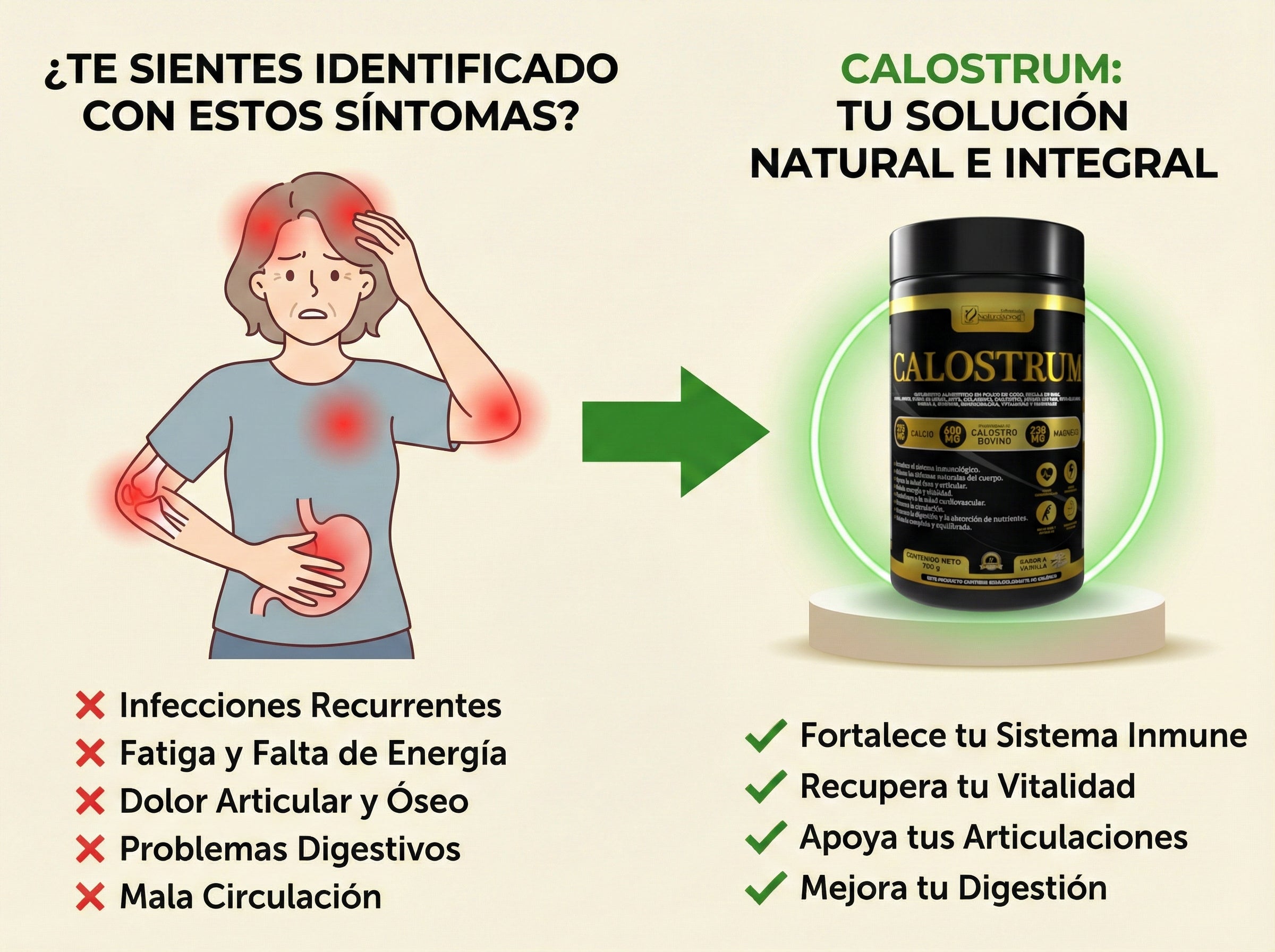 Compré este producto por el dolor en mis rodillas y la diferencia ha sido increíble. La combinación de Calcio, Colágeno y Calostro realmente funciona. Ahora puedo subir y bajar escaleras sin molestias. ¡Súper recomendado!