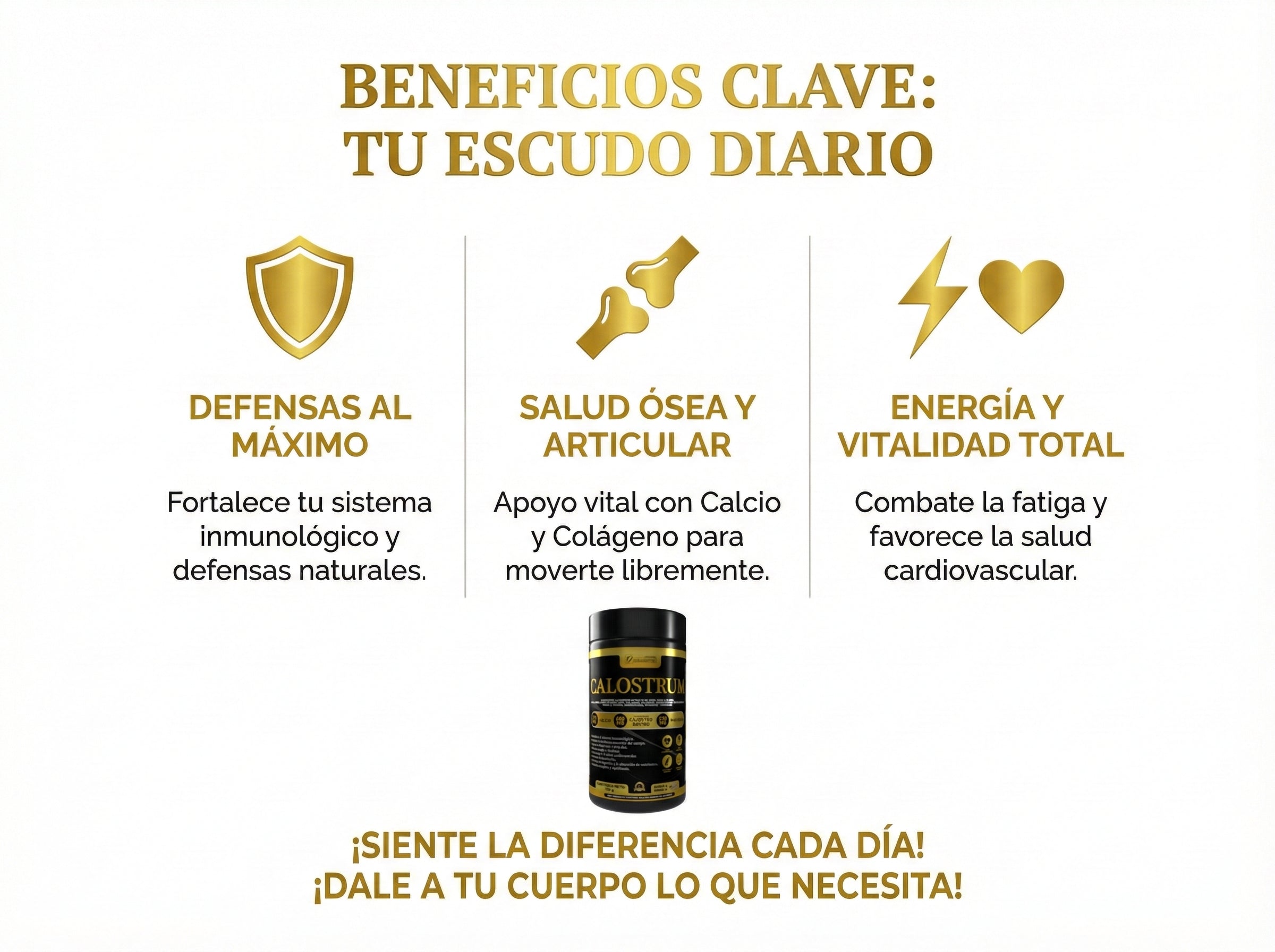 Es una fórmula "todo en uno". Su objetivo principal es fortalecer el sistema inmunológico (defensas), pero gracias a sus componentes añadidos también apoya la salud ósea, articular, cardiovascular y brinda energía y vitalidad.